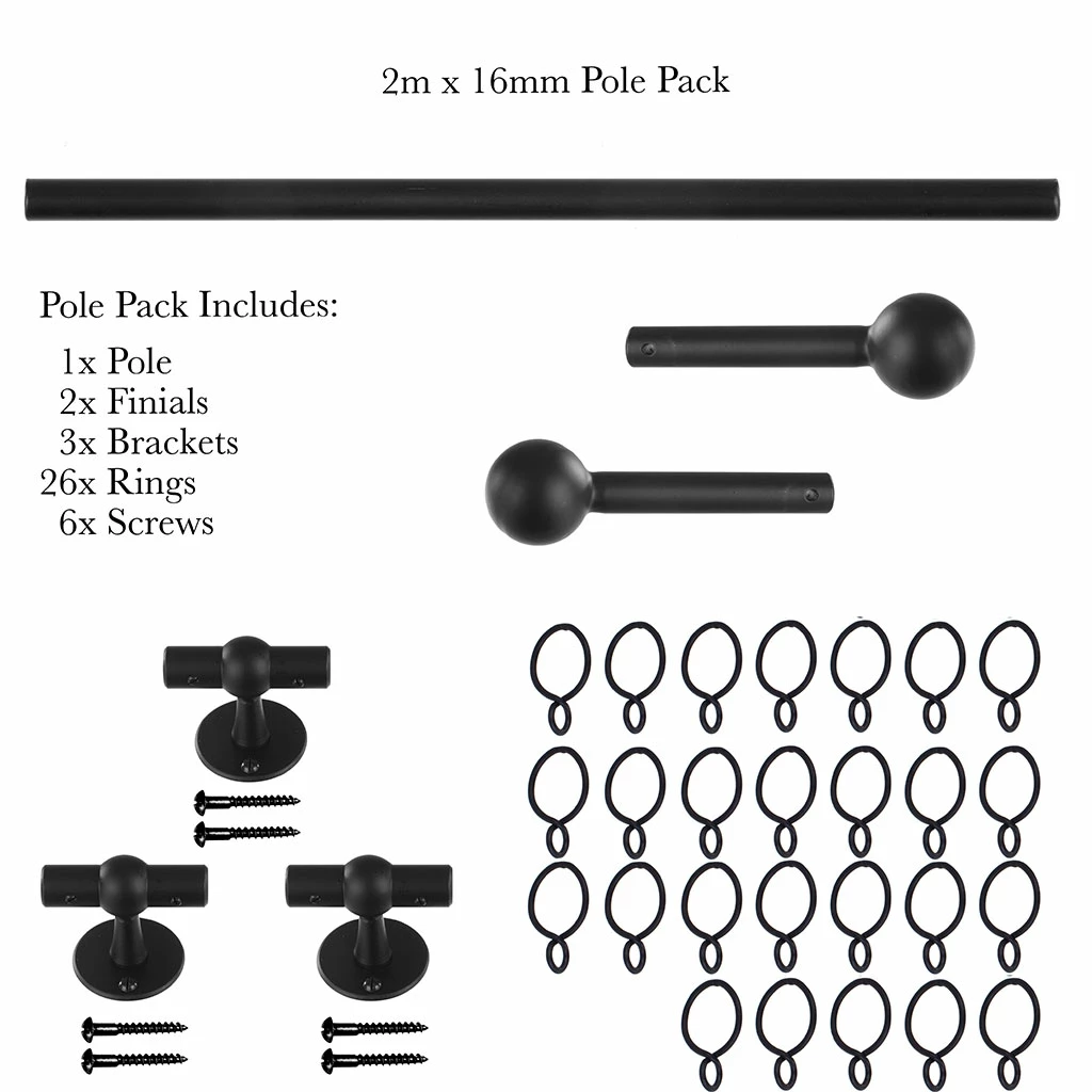Complete your curtain designs with our ready-made 2m, 16mm Cannonball Pole Pack in our smart, hardwearing, Matt Black finish, for a traditional look to your window. The packs are designed as an elegant, yet quick and easy alternative to our classic range of poles.