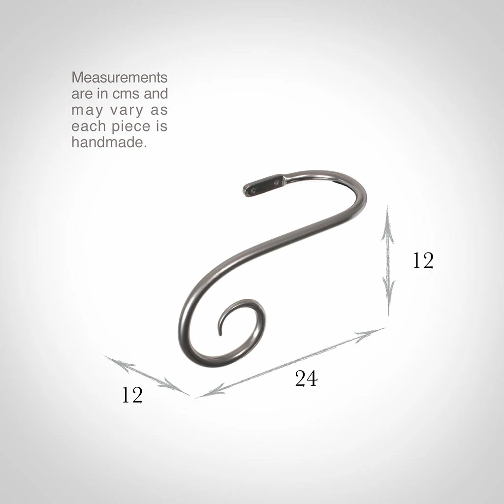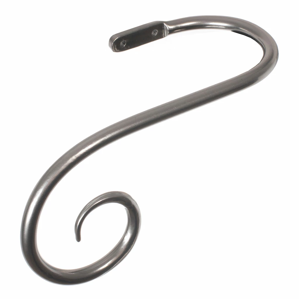 A hand forged, solid steel holdback to match our Crook finial. The holdbacks are available in two sizes: this larger holdback is generally recommended where there is more than one width of fabric in the curtain (unless it is a very light, unlined fabric).