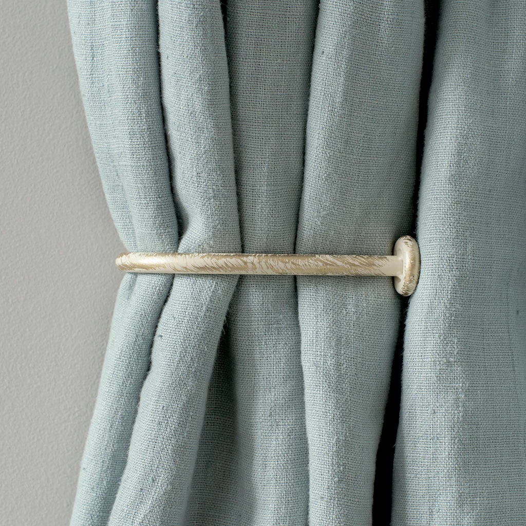 A hand forged, solid steel holdback to match our Button finial. The holdbacks are available in two sizes: this smaller holdback is generally recommended where there is only one width of fabric in the curtain (or more if it is a very light, unlined fabric).